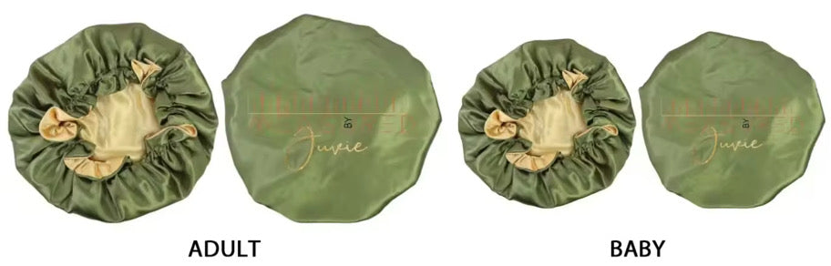 Custom Logo Double Layered Bonnet For Haircare. Bonnet is reversible and is great for sleepwear/ protecting hair. Comes In Light Pink & Olive Green.